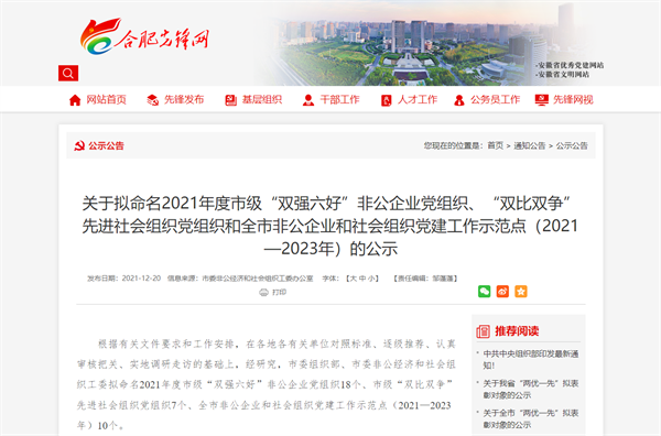 12月29日,合肥市委組織部、合肥市非公經(jīng)濟(jì)和社會(huì)組織工委公布了合肥市“雙強(qiáng)六好”黨組織名單,經(jīng)層層推選,嚴(yán)格考核,中水三立黨總支榮獲2021年度市級(jí)“雙強(qiáng)六好”非公企業(yè)黨組織榮譽(yù)稱號(hào)。