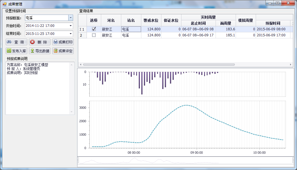 預(yù)報成果模塊實現(xiàn)對已保存的預(yù)報成果的查詢、刪除操作,實現(xiàn)對同一預(yù)報斷面不同預(yù)報方案或不同預(yù)報人員預(yù)報結(jié)果的對比,實現(xiàn)對預(yù)報結(jié)果的發(fā)布入庫功能,實現(xiàn)對預(yù)報成果的精度評定且可以查詢方案的各洪水場次的精度評定結(jié)果,實現(xiàn)預(yù)報成果的發(fā)布以及對發(fā)布成果的檢索和評定。該模塊由成果管理、精度評定、成果發(fā)布、成果檢索和成果評定組成。其中成果管理、精度評定的數(shù)據(jù)來源是預(yù)報專用庫,而成果發(fā)布、成果檢索和成果評定的數(shù)據(jù)來源是省局實時數(shù)據(jù)庫。